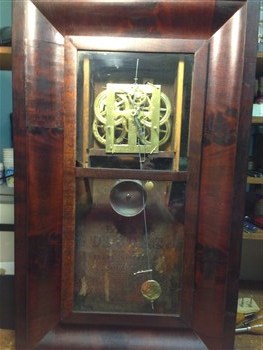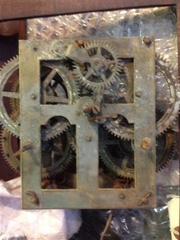 This photo and the one below depict the severely corroded and rusted movement from an American thirty hour Ogee clock brought in for repair.
