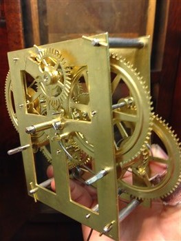 This photo and the one below depict the severely corroded and rusted movement from an American thirty hour Ogee clock brought in for repair. These remaining photos show the same movement after piece by piece restoration to a like new running condition.